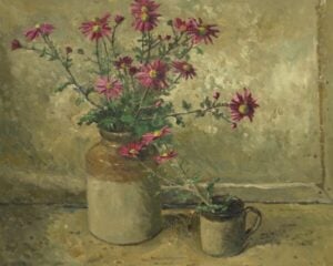 Carolyn Sergeant – Stone Jar, Mug and Crimson Daisies