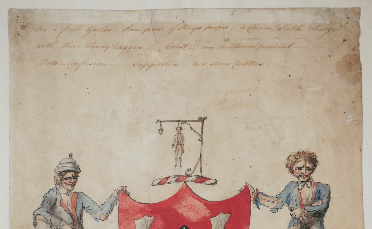 The crest, an ancestral pendant, shows a man dangling on a noose from a lamp-bracket. There are two men in ragged clothes holding the shield of arms, otherwise known as the Sans Culottes, these lower-class men were radical and militant partisans of the French Revolution. One of the men is holding a dagger with a severed head in his left hand. The shield shows three bloody daggers and three pairs of stays (corsets) set against a red background. In France stays appear to have only been worn by aristocracy. Paine was trained at an early age to follow his father’s trade as a staymaker.