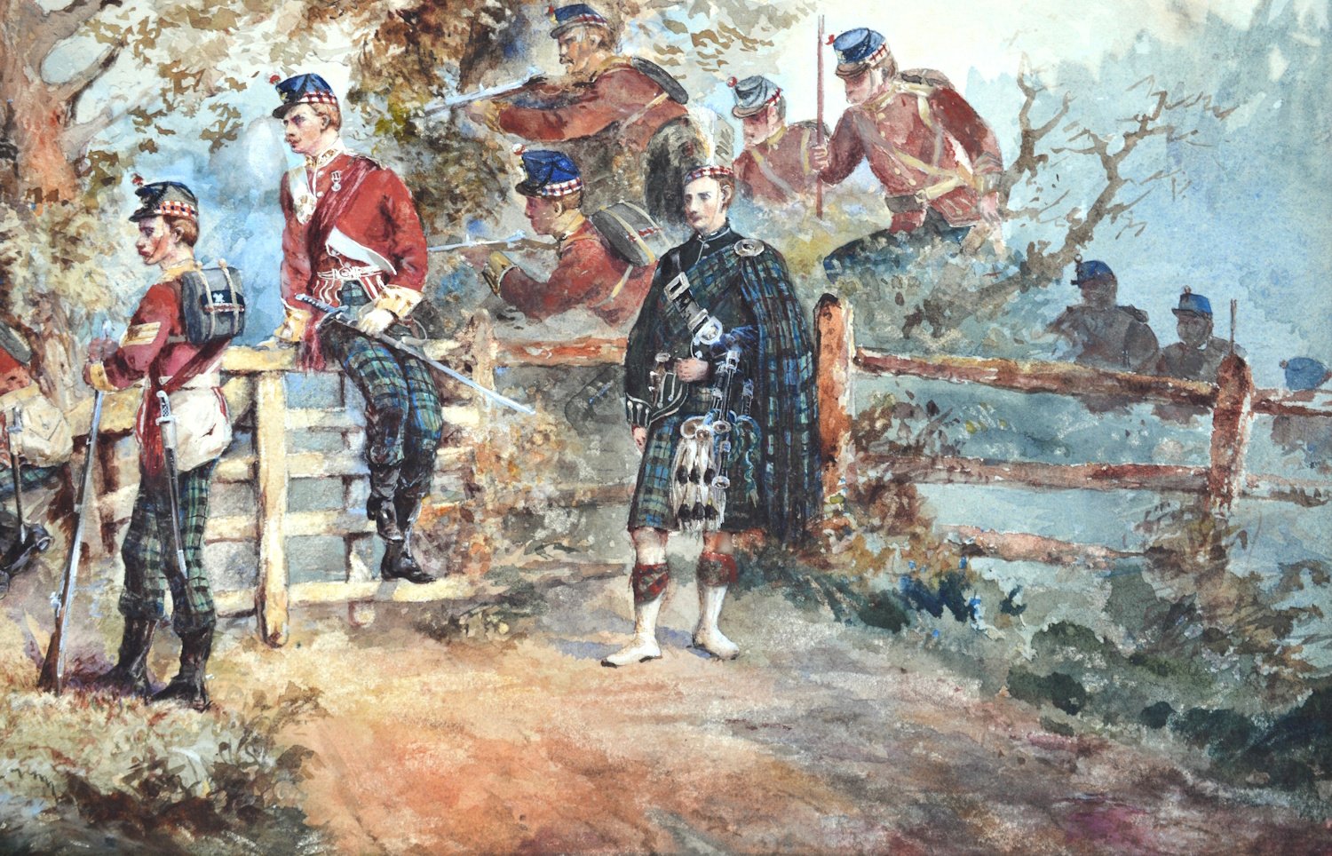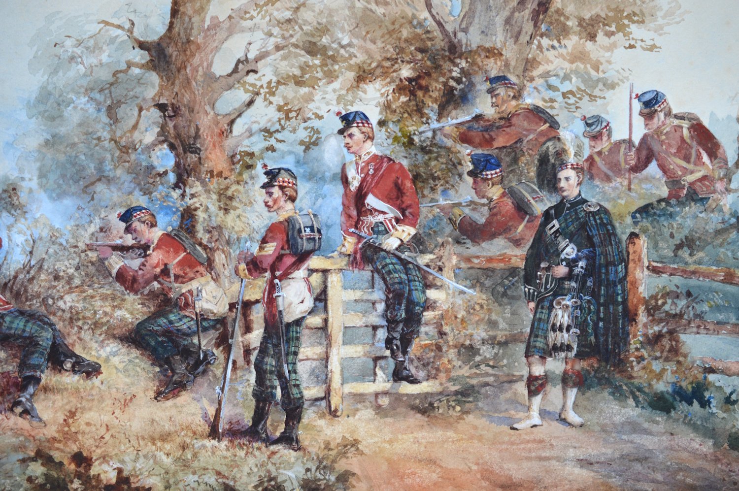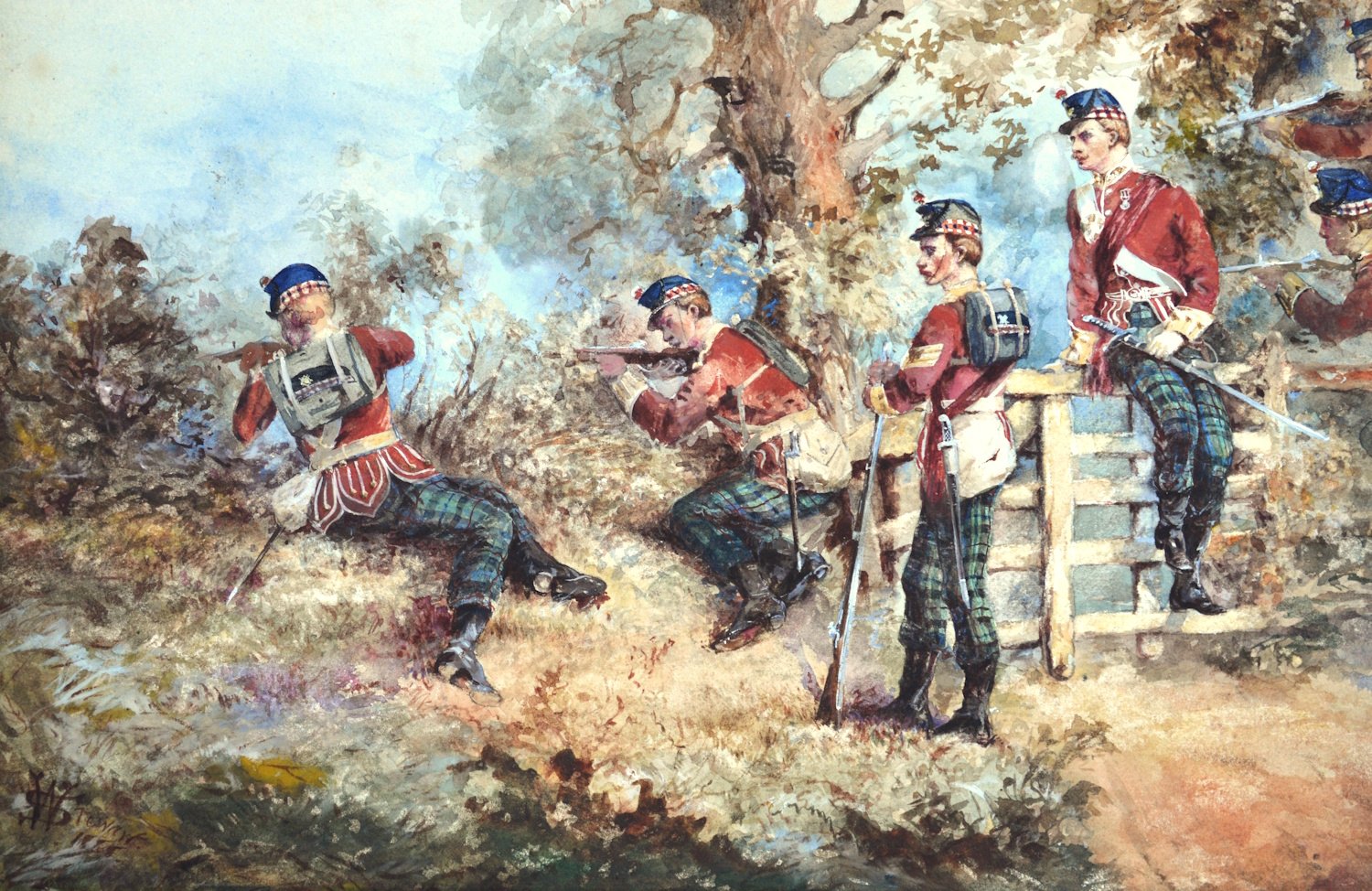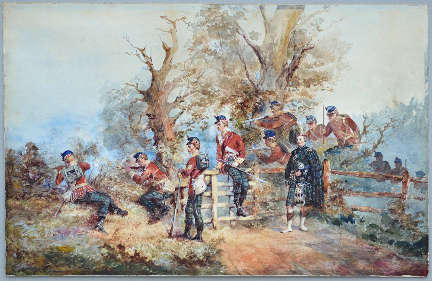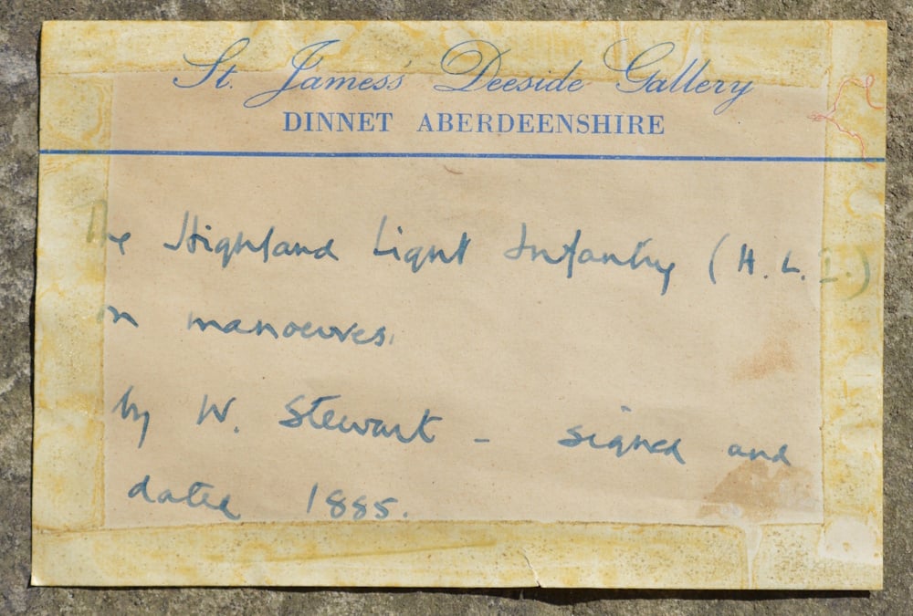 A large watercolour showing a group of the Highland Light Infantry on military maneuvers, painted in watercolour and body colour on wove paper. The picture is signed W. Stewart and is dated 1888 (lower left). One possible artist would be William Stewart, listed in the Dictionary of British Artists 1880 – 1940. He exhibited from 1880 to 1894 and was living in Greenock at the time the picture was painted. William Stewart exhibited one work at the Royal Society of Artists, Birmingham, nineteen works at the Glasgow Institute of Fine Arts, one work at the Walker Art Gallery, Liverpool and eleven works at the Royal Scottish Academy. The picture is being offered without a mount or a frame.